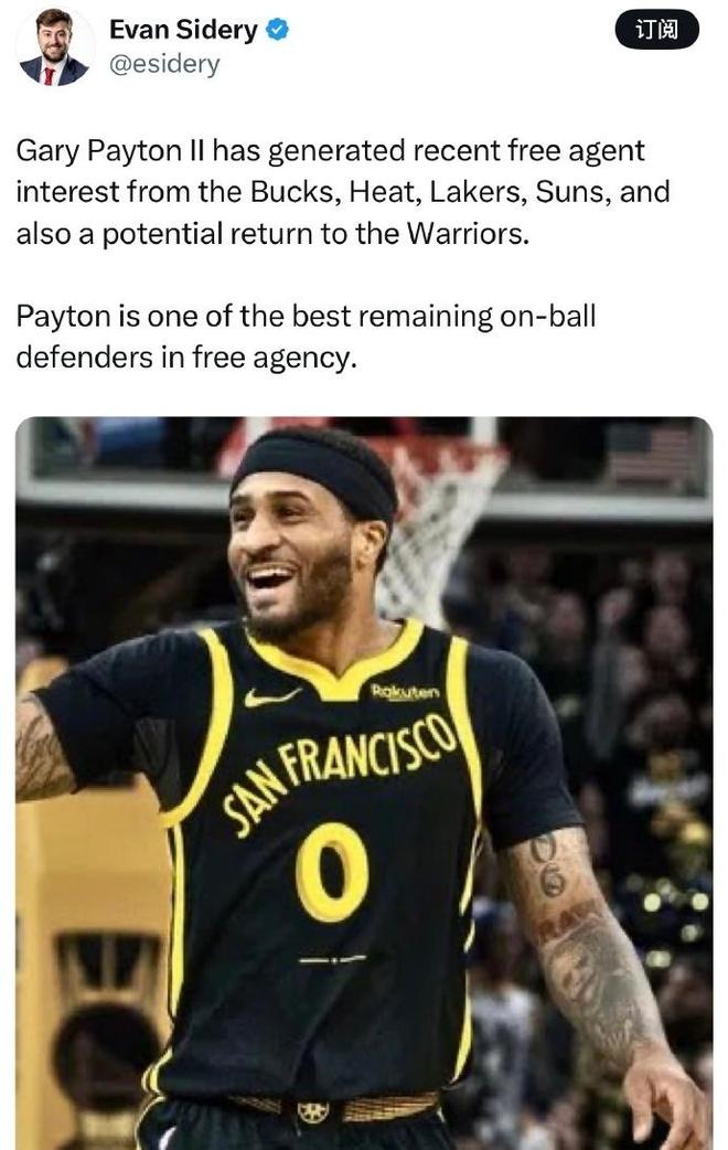 根據(jù)報(bào)道,多支球隊(duì)有興趣招募得到小佩頓,其中包括湖人、雄鹿、熱火與太陽(yáng),小佩頓曾經(jīng)在2017-18賽季效力過湖人一個(gè)賽季。小佩頓也存在重返勇士效力的可能性,畢竟他過去在勇士待著打球極為舒服。