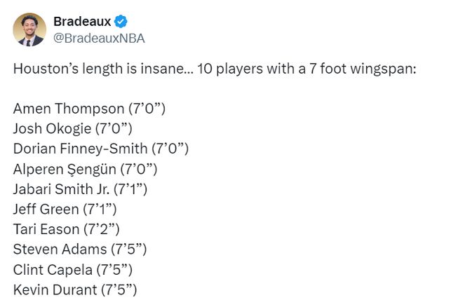 簽下奧科吉后,隊記Bradeaux更新社媒寫道:“火箭隊的臂展簡直令人驚嘆……有10名球員的臂展達到了7英尺(2米13)及以上——