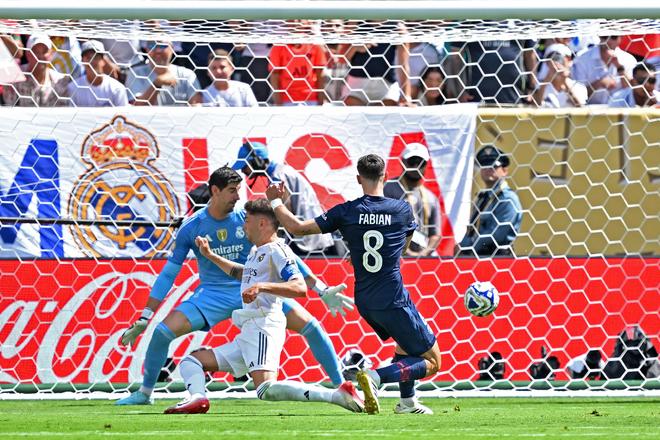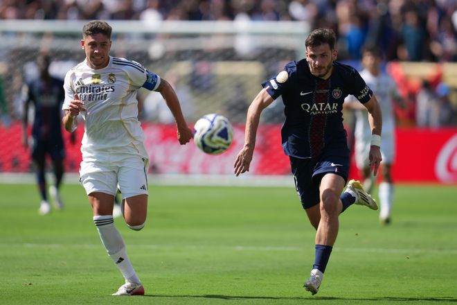 第24分鐘,登貝萊又一腳直塞打穿防線,阿什拉夫助攻魯伊斯破門,3比0……上半場(chǎng)時(shí)間剛過(guò)半,皇馬就已3球落后,被大巴黎打成了篩子,連……邁阿密國(guó)際都不如。大比分領(lǐng)先之后,大巴黎踢得更從容,貢薩洛悠閑地上演馬賽回旋,轉(zhuǎn)身抽射將比分定格為4比0。